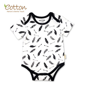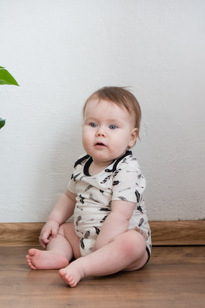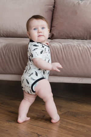 This fun feathers-and-arrows bodysuit will keep your baby feeling as good as they look. The soft organic cotton material features several different styles of bird feathers and tiny arrows scattered throughout, as well as black accent edging at the top and bottom for extra eye-catching flair. Your little one can wear this bodysuit by itself or with a pair of trousers, shorts, or a skirt for a complete outfit.