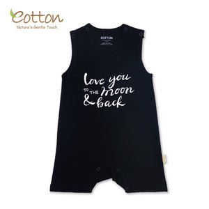 Simple, sleek, and timeless, this black sleeveless baby romper is made of organic cotton for a soft, gentle feel that's perfect for your baby's sensitive skin. Nickel-free safety snaps at the shoulders and gusset help you change outfits or nappies without tangling up little arms and legs. The front of the romper reads "Love you to the moon and back" in graceful white script: a beautiful note to your little one that tells them just how much you cherish them.