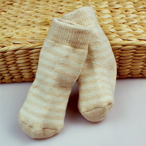 • Gender-neutral baby socks feature an eye-pleasing cream and tan striped pattern.
