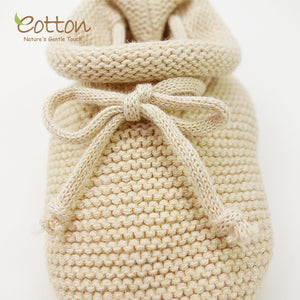 Cute knitted booties for tiny feet. The laces are adjustable so you can be sure the booties will stay in place. Your baby can play with them and learn to tie his own shoes (oh well, at least pretend). 100% organic cotton.
