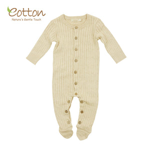 A cheeky little nod to long johns, our organic cotton knitted Vancouver romper features straight-cabled texture that runs from neck to ankle, and a medium-weight design that keeps your baby warm and comfortable, even on cold winter days. Round wooden buttons dot the front and the inside of each leg, making it easy to button this romper over thin undershirts or a bodysuit for layering.